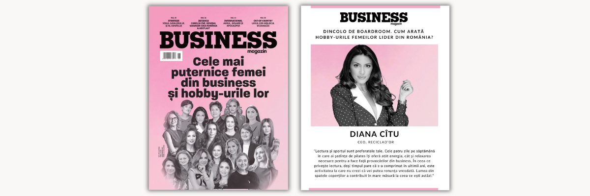 Diana Cîtu, CEO Reciclad'OR, a apărut pe coperta Business Magazin, alături de alte femei remarcabile, în cadrul selecției „Cele mai puternice femei din business și hobby-urile lor”.